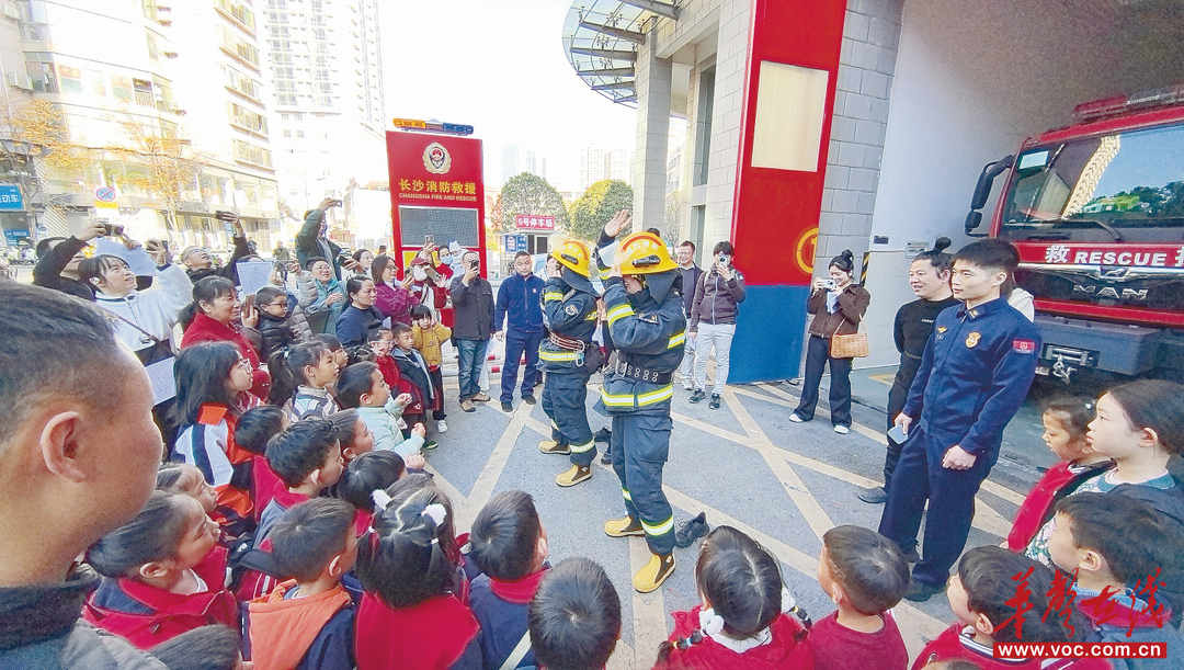 11月29日,消防員向孩子們展示快速穿戴消防服。當天,長沙市政府機關荷花幼兒園大一班的小朋友走進該市芙蓉區五一廣場消防救援站,參觀消防營院,體驗裝備器材操作,學習消防知識,提升安全意識和自救能力。