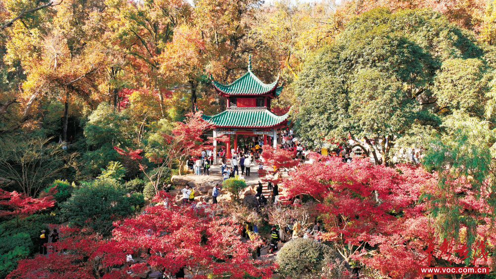 11月30日,長沙市岳麓山風(fēng)景名勝區(qū)的楓葉紅遍枝頭,進(jìn)入最佳觀賞期。被譽(yù)為“中國四大名亭”之一的愛晚亭四周紅楓絢爛如火,吸引眾多游客拍照打卡。