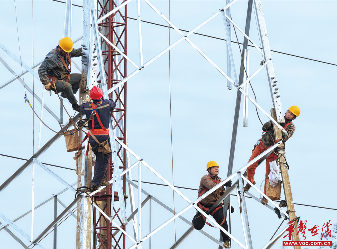 12月15日,嘉禾縣龍潭鎮扶塘村,電力工人在110千伏肖麥線工程現場進行組塔施工作業。