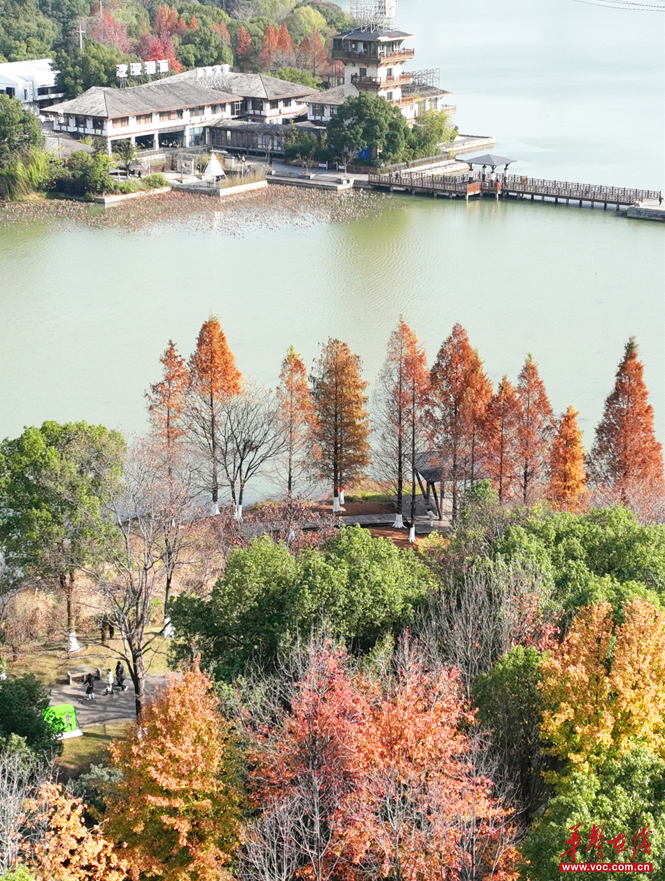 12月13日,長沙市開福區月湖公園,紅黃綠相間的樹木與清澈湖水交相輝映,構成一幅人與自然和諧共生的美麗畫卷。