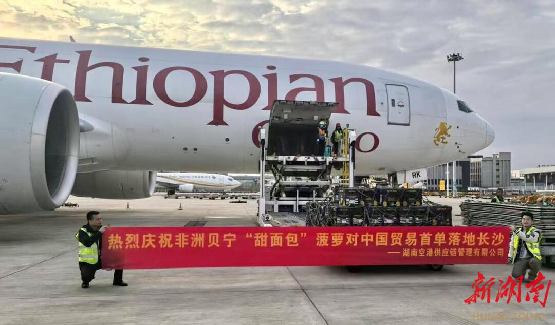 此次運抵長沙的貝寧“甜面包”菠蘿共117箱,從貝寧當地機場起飛,搭載湖南空港供應鏈管理有限公司投資運營的埃塞俄比亞航空公司“波音777”全貨運航線,經埃塞俄比亞轉機后飛抵長沙機場口岸,全程僅17個小時。該航線是湖南省唯一一條通往非洲的全貨運航線,也是我省首條“第五航權”航線,每周3-5個航班,單趟可裝載102噸左右的貨物。
