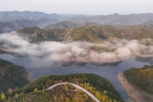 12月15日清晨,祁東縣紅旗水庫,蒸騰的云霧與青山湖水交相輝映,蜿蜒公路點綴其間,構成一幅如詩的山水畫卷。