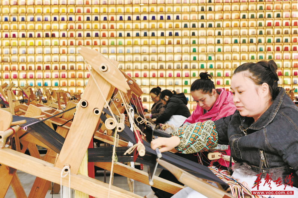 12月15日,張家界市武陵源區(qū)乖幺妹土家族織錦基地,工人在制作土家族織錦產(chǎn)品。臨近年末,該基地的工人們根據(jù)旺季訂單趕制家居裝飾品等特色商品,力爭超額完成全年銷售目標(biāo)。