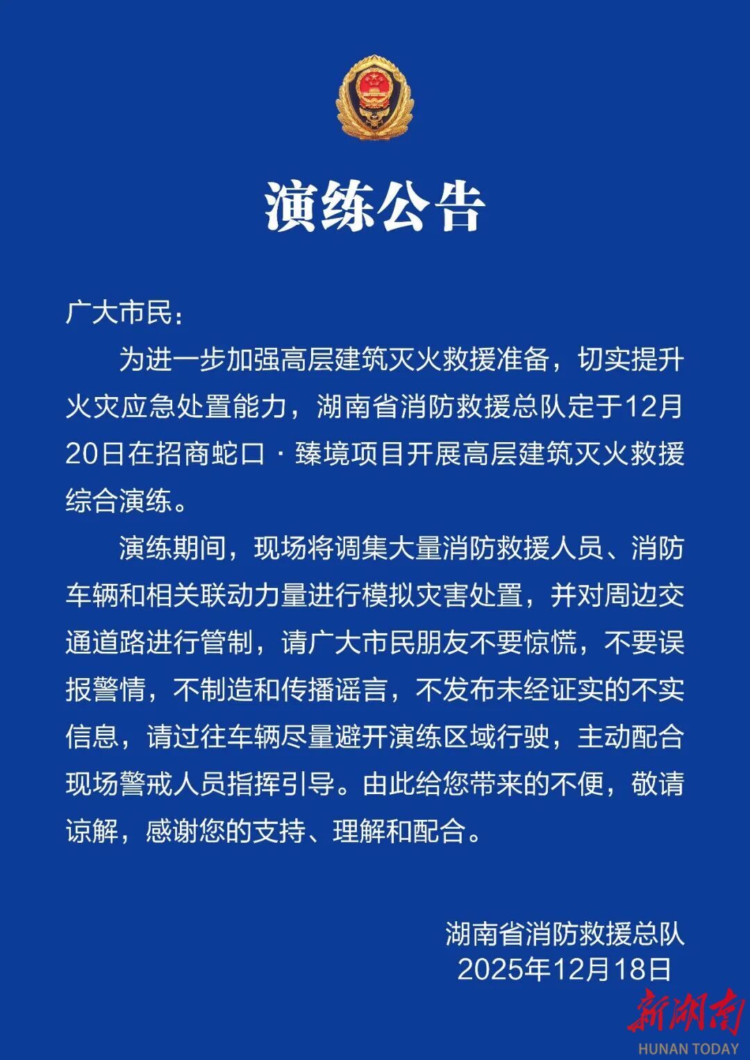 華聲在線 12月19日訊(全媒體記者 奉永成)記者今天從湖南省消防救援總隊獲悉,12月20日,湖南省消防救援總隊將在長沙市梅溪湖招商蛇口·臻境項目開展高層建筑滅火救援綜合演練。演練期間將調集大量消防救援人員、消防車輛和相關聯動力量進行模擬處置火情,并對周邊道路進行交通管制,請大家不要驚慌。